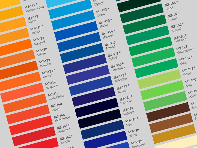 La série Metamark 7 comprend des nuances populaires de rouges et de bleus qui continuent de dominer les graphismes commerciaux, ainsi que des teintes contemporaines reflétant les tendances modernes telles que les gris, les verts frais et les oranges éclatants.